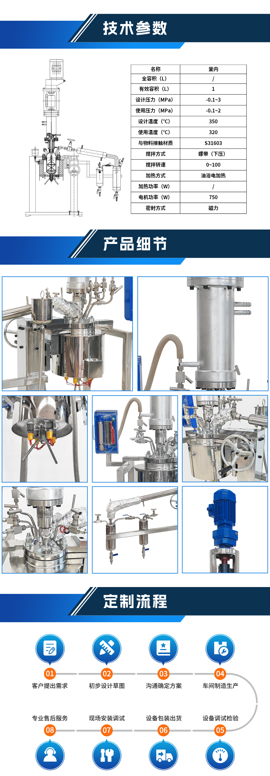如果用戶在釜蓋、釜體開口、內(nèi)部結(jié)構(gòu)、壓力高低、攪拌槳葉、及增加其他輔助裝置(如冷凝回流裝置、冷凝器、恒壓加料罐、接收裝置)等有特殊要求,可完全按用戶的要求加工制造 |