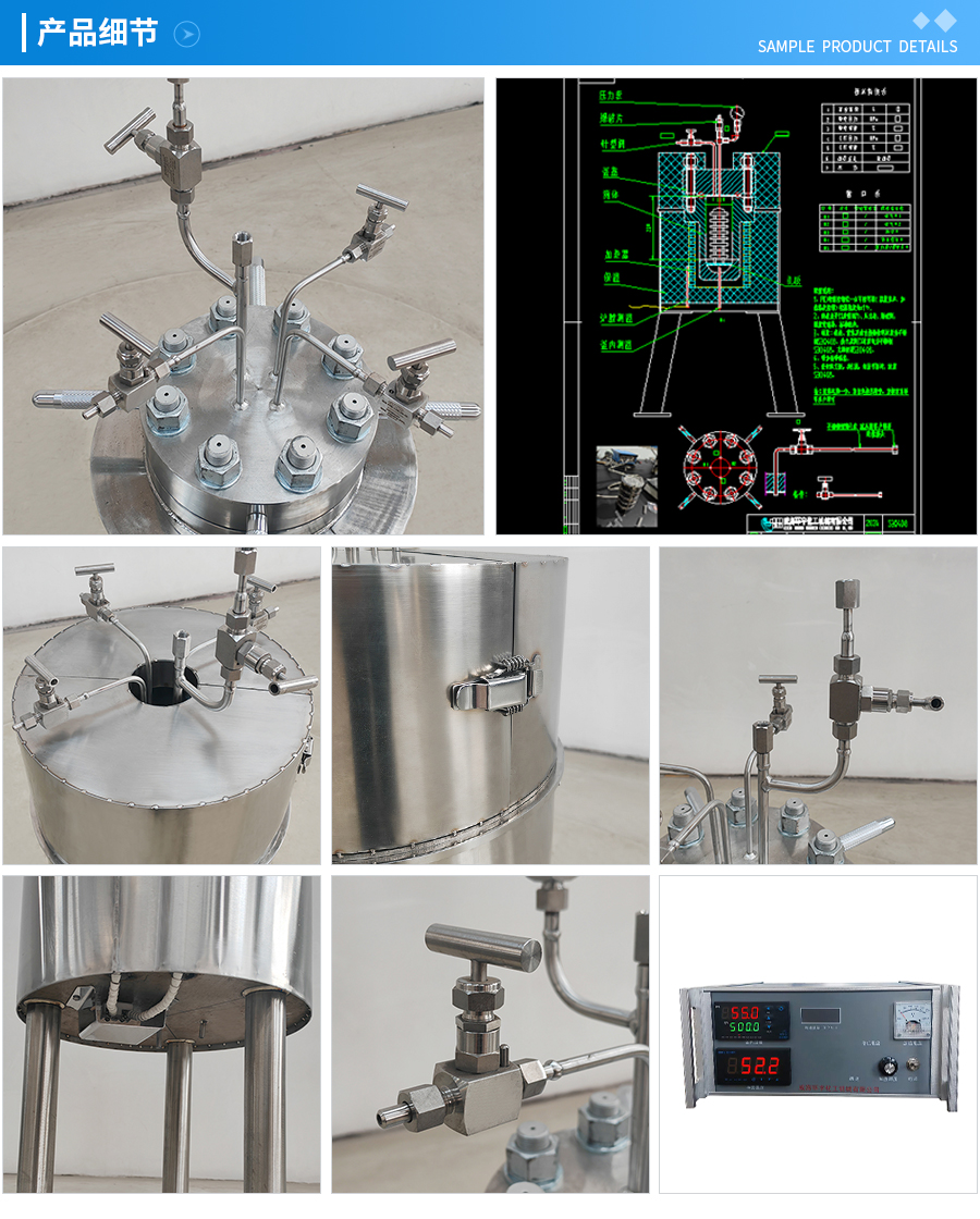 常規(guī)釜蓋開口 氣相口配針形閥,液相口配針形閥及釜內(nèi)插底管,固體加料口配絲堵,測(cè)控溫口配鉑電阻,壓力表安全爆破口配壓力表及安全防爆裝置,釜內(nèi)冷卻盤管進(jìn)、出口配水咀